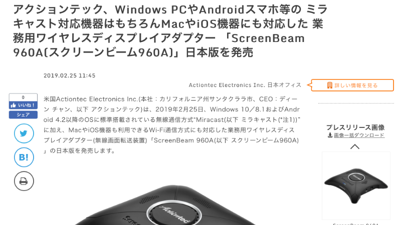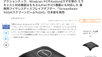 Windows PCやAndroidスマホ等の ミラキャスト対応機器はもちろんMacやiOS機器にも対応した 業務用ワイヤレスディスプレイアダプター 「ScreenBeam 960A(スクリーンビーム960A)」日本版を発売 米国Actiontec Electronics Inc.(本社:カリフォルニア州サンタクララ市、CEO:ディーン チャン、以下 アクションテック)は、2019年2月25日、Windows 10/8.1およびAndroid 4.2以降のOSに標準搭載されている無線通信方式“Miracast(以下 ミラキャスト(*注1))”に加え、MacやiOS機器も利用できるWi-Fi通信方式にも対応した業務用ワイヤレスディスプレイアダプター(無線画面転送装置)「ScreenBeam 960A(以下 スクリーンビーム960A)」の日本版を発売します。