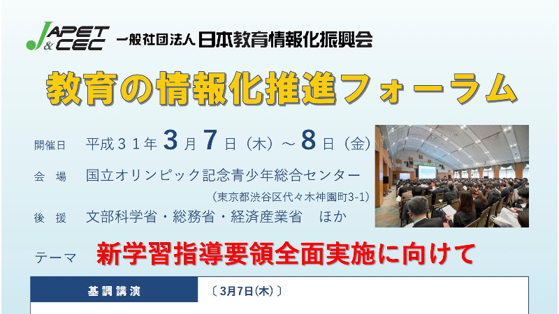 3月7日(木)〜3月8日(金) 平成30年度 教育の情報化推進フォーラムに参加します。