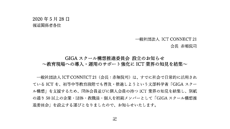 すでに会社で日常的に活用されているICTを、初等中等教育段階でも普及・推進しようという文化科学相「GIGAスクール構想」を支援するため、50以上の企業・団体・教職員・個人を初期メンバーとした「GIGAスクール構想推進委員会」が設立され、弊社も参加しています。