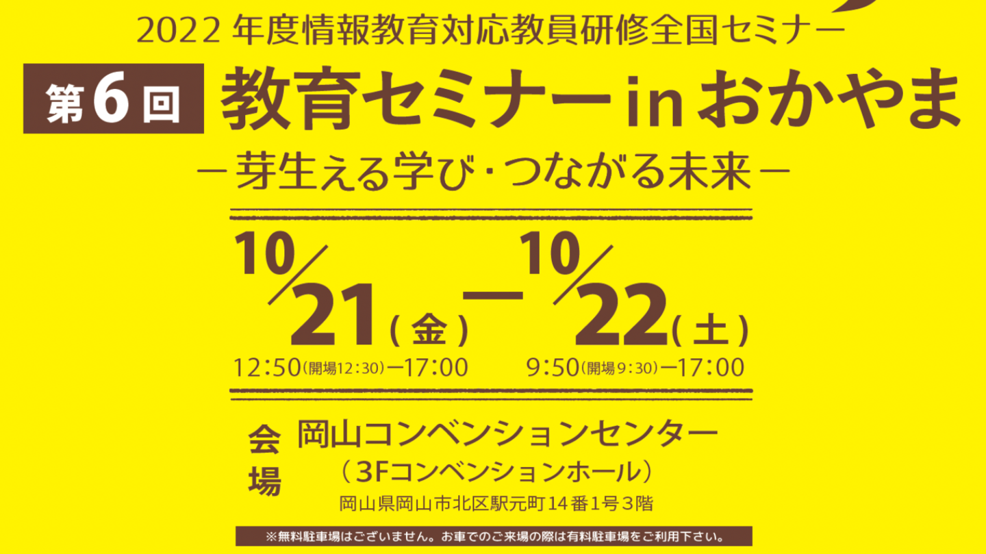 学校現場では2020年のGIGAスクール構想において多くの端末、ネットワークが整備されました。GIGAスクール2年目のチャレンジとして、令和の新しい時代の学校教育の実現に向け、どのように活用すればよいのかを共に考え、学ぶ場、集う場として「第6回教育セミナーinおかやま」を開催いたします。 当日は文部科学省はじめ、多数の有識者の講演・セミナーや実践者の授業での活用発表等多数用意してお待ちしております。また、新型コロナウイルスの状況を考慮しつつ会場とオンラインのハイブリット形式で予定しています。今年も皆さまのお役に立てる情報をたくさん集めて開催いたします。